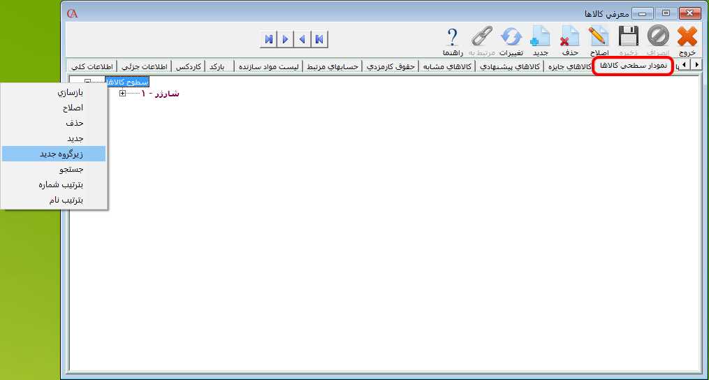 بعد از تعریف زیر گروه کالا، برای تعریف کالا ابتدا زیر گروه مورد نظر را در حالت انتخاب قرار دهید سپس بر روی آن کلیک راست کنید و گزینه "زیر گروه جدید" را انتخاب کنيد.