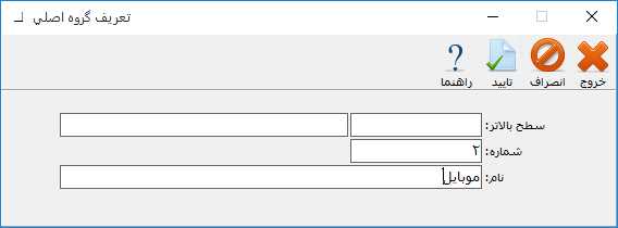 در فرم باز شده در قسمت شماره، کد گروه اصلی و در قسمت نام، نام گروه اصلی کالا را وارد سپس بر روی دکمه تاييد کليک کنيد. توجه داشته باشید که در نمودار سطحی کالاها، گروه اصلی کالا با رنگ قرمز نمایش داده میشود.