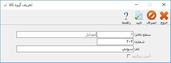 در فرم باز شده در قسمت سطح بالاتر، کد و نام سطح بالاتر نمایش داده میشود. در قسمت شماره، کد زیر گروه و در قسمت نام، نام زیر گروه را وارد کنید. سپس تیک پارامتر "آخرین زیرگروه" را فعال سپس بر روی دکمه تایید کلیک کنید. توجه داشته باشید که در نمودار سطحی کالاها، زیر گروه کالا با رنگ سبز نمایش داده میشود.