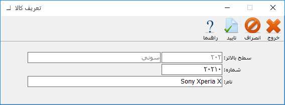 در فرم باز شده در قسمت سطح بالاتر کد و نام سطح بالاتر کالا نمایش داده میشود. در قسمت شماره، کد کالا و در قسمت نام، نام کالا را وارد کنید سپس بر روی دکمه تایید کلیک کنید. توجه داشته باشید که در نمودار سطحی کالاها، کالا با رنگ آبی نمایش داده میشود.
