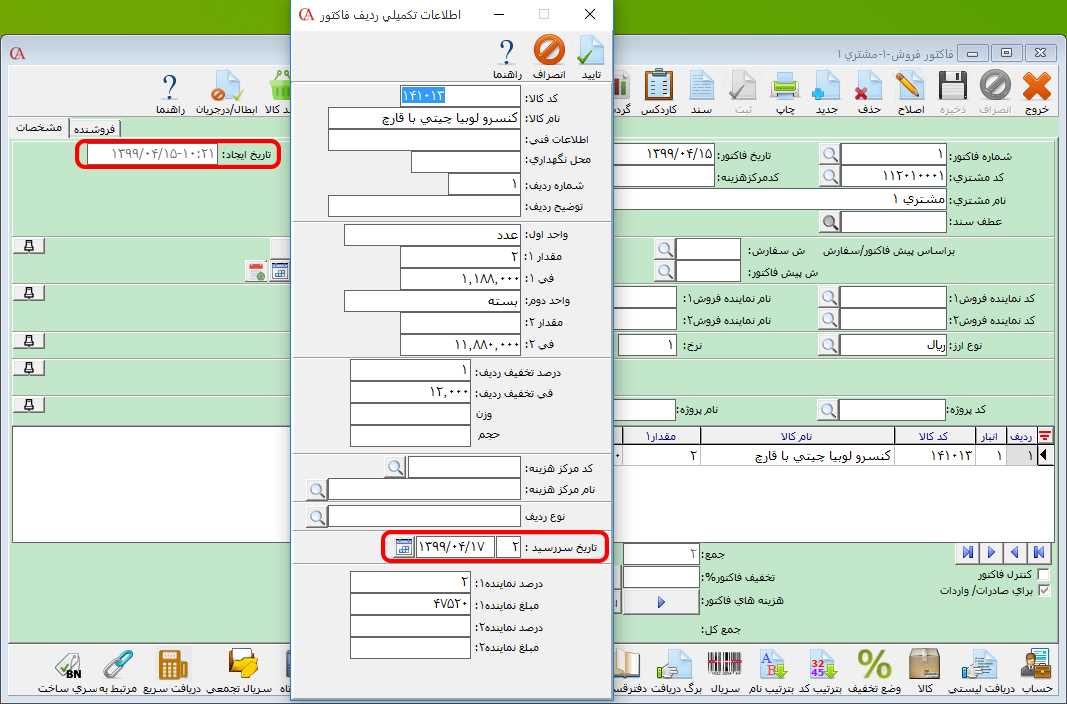 در قسمت نماینده فروش 1 و 2، درصد فروش نماينده فروش 1 و نماينده فروش 2 را از فروش کالا مشخص کنيد. چنانچه تیک پارامتر "محاسبه مبلغ مامور فروش بر اساس مقدار فروش" را فعال کنید، در این صورت در قسمت نماینده فروش 1 و 2 میتوانید مبلغ کمیسیون مامور فروش را در ازای هر فروش کالا وارد کنید. در قسمت انبار پيش فرض، میتوانید از لیست انبارها، انبار پیش فرض کالا را انتخاب کنيد. در قسمت تاریخ ایجاد، تاریخ ایجاد کالا نمایش داده میشود. در قسمت تعداد روز تاریخ سررسید، میتوانيد تعداد روز تسويه ردیف فاکتور را مشخص کنيد به عنوان مثال شما کالايی به نام کنسرو قارچ و لوبیا دارید که مشتری در صورت خريد اين کالا بايد بعد از 2 روز مبلغ اين فاکتور را تسويه کند. با وارد کردن تعداد روز 2 در اين فيلد، در صورتی که در فاکتور اين کالا انتخاب شود، تاریخ سررسید ردیف فاکتور به صورت اتوماتيک 2 روز بعد از تاریخ صدور فاکتور محاسبه میشود. توجه داشته باشید که فیلد تعداد روز تاریخ سررسید در نرم افزار حسابگر نسخه 10 قابل استفاده است. نکته: در صورتی که برای کالاها تاریخ سررسید تعریف نمایید و در فاکتور آنها را انتخاب کنید، تاریخ سررسید فاکتور بر اساس این تاریخها محاسبه میشود.