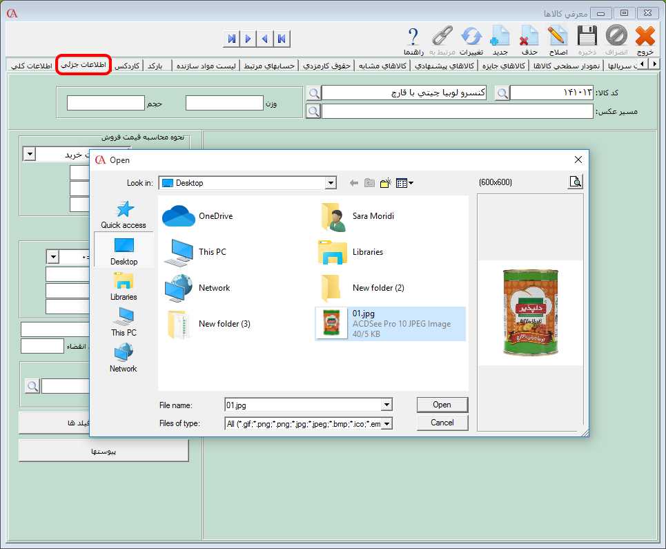 اطلاعات جزئی در نرم افزار حسابگر برای تعیین اطلاعات جزئی مربوط به کالا مانند عکس کالا، وزن، حجم و نحوه محاسبه قيمت فروش و ... وارد زبانه اطلاعات جزئی شوید. در قسمت کد يا نام کالا، کالای مورد نظر را با استفاده از دکمه ذرهبین از لیست کالاها انتخاب کنید. چنانچه بخواهید به کالا عکس اختصاص دهید برای انتخاب عکس در قسمت "مسیر عکس" بر روی دکمه ذرهبین کلیک کنید. در فرم باز شده میسر عکس و فایل عکس را انتخاب سپس بر روی دکمه Open کلیک کنید. نکته: در صورتی که از نسخه تحت شبکه استفاده میکنید برای این که تمامی کاربران بتوانند عکس کالا را مشاهده کنند، مسیر عکس باید در یک پوشه به اشتراک گذاشته شده (Share) با دسترسی کامل باشد.