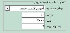 در قسمت نحوه محاسبه قیمت فروش میتوانيد قيمت پيشفرض فروش را بر اساس سطوح قيمت کالا (قيمت سطح 1، سطح 2، سطح3، سطح4، سطح 5، آخرين قيمت خريد و آخرين قيمت فروش) تعيين کنيد. به عنوان مثال فرض کنید میخواهيد قيمت پيش فرض فروش کالا به این صورت محاسبه شود که به قیمت آخرین قیمت خرید، 20% اضافه سپس به علاوه 2000 ريال شود و تا دو رقم اعشار روند شود. قسمت نحوه محاسبه دارای سه بخش به شرح زیر است: درصد: اين قسمت مشخص میکند که قيمت سطح مورد نظر شما به علاوه چند درصد شود. ثابت: این قسمت مشخص میکند که قيمت محاسبه فوق به علاوه چند ريال شود. رقمهای روند: این قسمت مشخص میکند که عدد بدست آمده تا چند رقم روند شود. برای مثال مطرح شده در این بخش باید درصد را 20، ثابت را 2000 و رقمهای روند را 2 وارد کنید.