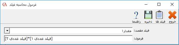 در قسمت "فرمول محاسبه فيلدها" میتوانيد برای مقداردهی فيلدها در فاکتور، فرمول مشخص کنيد. به عنوان مثال فرض کنید قصد فروش کالايی مانند پارچه دارد که فروش آن بر اساس متر مربع است و برای محاسبه متر مربع بايد طول پارچه در عرض آن ضرب شود. برای این کار میخواهید طول پارچه را در فیلد عددی 1 و عرض آن را در فیلد عددی 2 وارد کنید سپس حاصل ضرب آنها به عنوان مقدار فروش در فاکتور در فیلد مقدار 1 ذخیره شود. برای انجام اين مثال میتوانيد از قسمت فرمول محاسبه فیلدها استفاده کنيد. برای معرفی فرمول، بر روی دکمه "فرمول محاسبه فیلدها" کلیک کنید.