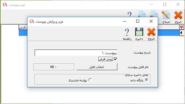 در فرم باز شده برای تعریف یک فایل پیوست جدید بر روی دکمه جدید کلیک کنید. در قسمت شرح پیوست، شرح مربوط به پیوست را وارد کنید. برای انتخاب فایل بر روی دکمه انتخاب فایل کلیک کنید و فایل مورد نظر را انتخاب کنید. در قسمت محل ذخیرهسازی، مشخص کنید که میخواهید فایل پیوست در پایگاه داده مربوط به شرکت ذخیره شود یا در فضای دیسک کامپیوتر. در صورت انتخاب ذخیره در پایگاه داده فایل پیوست شما در بانک اطلاعاتی مربوط به شرکت ذخیره میشود و در صورت بازیابی اطلاعات، علاوه بر اطلاعات شرکت فایلهای پیوست نیز بازیابی میشود. در صورتی که بخواهید فایل پیوست به عنوان پیشفرض سیستم در نظر گرفته شود، تیک پارامتر "پيشفرض" را فعال کنید. سپس بر روی دکمه ذخیره کلیک کنید.