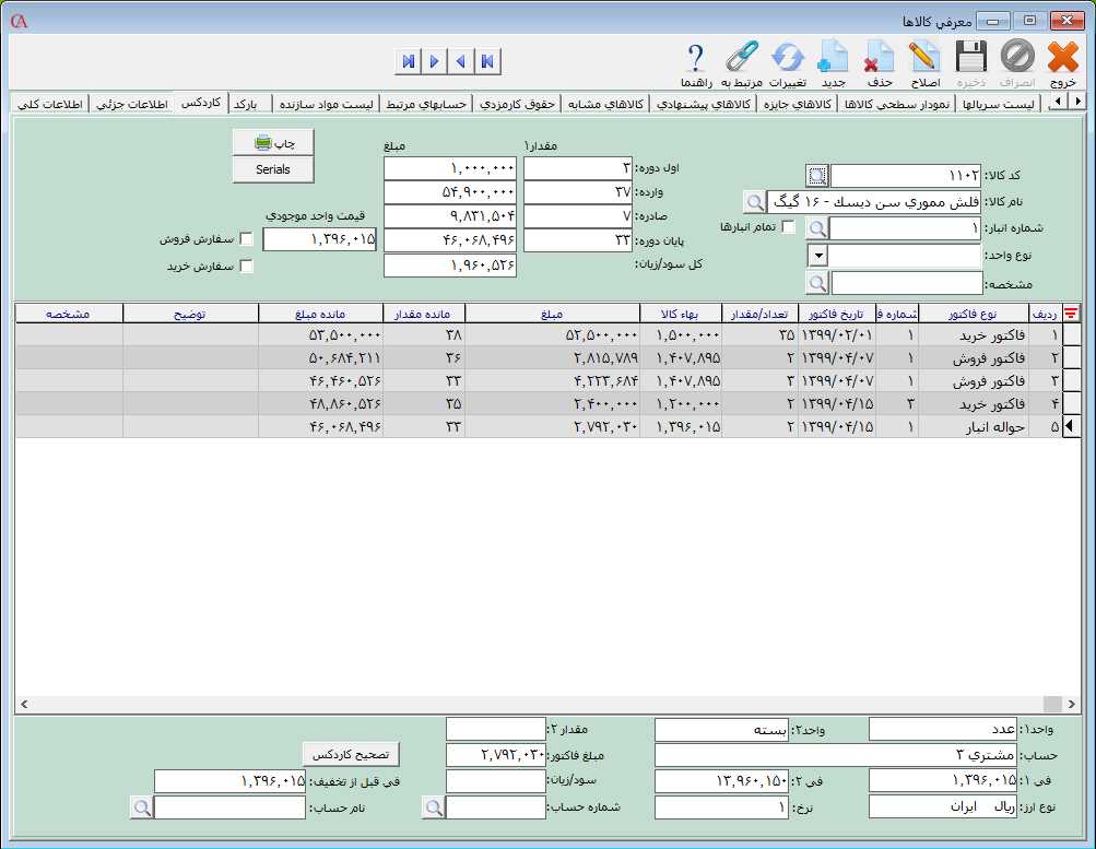 در قسمت اول دوره، مقدار و مبلغ اول دوره کالا نمايش داده میشود. در قسمت وارده، مقدار و مبلغ کالاهای وارد شده و در قسمت صادره، مقدار و مبلغ کالاهای صادر شده در سیستم نمایش داده میشود. در قسمت پايان دوره، مانده مقداری و مبلغی كالا تا لحظه تهیه گزارش نمايش داده میشود. در قسمت قيمت واحد موجودی، قيمت ميانگين کالا در انبار نمایش داده میشود و در قسمت کل سود/زیان، مبلغ کل سود و زیان کالا نمایش داده میشود.