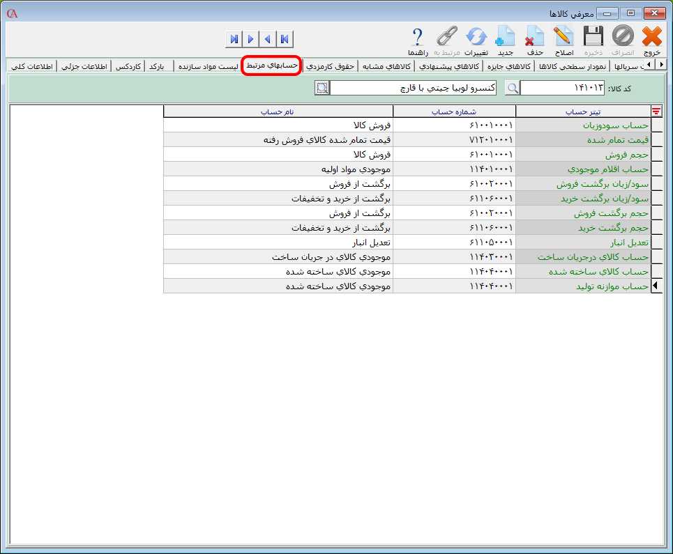 بارکد در زبانه بارکد میتوانید برای هر کالا علاوه بر بارکد تعریف شده در زبانه اطلاعات کلی، 20 بارکد دیگر تعریف نمایید. حسابهای مرتبط در حسابگر میتوانید حسابهای مربوط به کالاها را از هم متمايز کنید. به عنوان مثال در کدينگ پيشفرض برنامه برای کليه کالاها، حساب فروش، حساب "فروش کالا" در نظر گرفته میشود که میتوانید در صورت نیاز برای کالا 1 "حساب فروش کالا 1"و برای کالا 2 "حساب فروش کالا 2" را تعیین سپس برای دیگر حسابها مانند سود و زیان و... نیز به همین ترتیب اقدام کنید. برای مشاهده یا تغییر حسابهای مرتبط با کالا وارد زبانه حسابهای مرتبط شوید. نکته: چنانچه به مباحث مربوط به ارتباط حسابهای حسابداری و انبارداری آشنایی ندارید، توصیه میشود حسابهای مرتبط به کالا را تغییر ندهید.