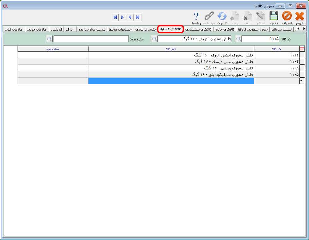 لیست مواد سازنده و حقوق کارمزدی در صورتی که از نرم افزاز حسابگر صنعتی استفاده میکنید در زبانه لیست مواد سازنده، میتوانید مواد اولیه جهت تولید محصولات و در زبانه حقوق کارمزدی میتوانید حقوق کارمزدی کالا را مشخص کنید. در مقالات قبلی به طور کامل زبانه لیست مواد سازنده و حقوق کارمزدی به همراه محاسبه قیمت تمام شده توضیح داده شده است که میتوانید به مقاله آموزشی مربوط به آن مراجعه فرمایید. کالاهای مشابه در زبانه کالاهای مشابه میتوانید کالاهای مشابه به کالای انتخابی را مشخص کنید. به عنوان مثال فرض کنید کالایی به نام "فلش مموری 16 گیگ از برند hp" دارید و میخواهید در صورتی که مشتری این کالا را انتخاب کرد و کالا موجود نبود، فلشهای مشابه آن را به مشتری معرفی کنید. برای اختصاص کالای مشابه در قسمت کد و نام کالا، کالای مورد نظر را انتخاب کنید. در جدول این فرم یک سطر جدید ایجاد کنید. در ستون کد یا نام کالا، کالای مورد نظر را از لیست کالاها انتخاب کنید. بعد از تعیین کالاهای مشابه بر روی دکمه ذخیره کلیک کنید.