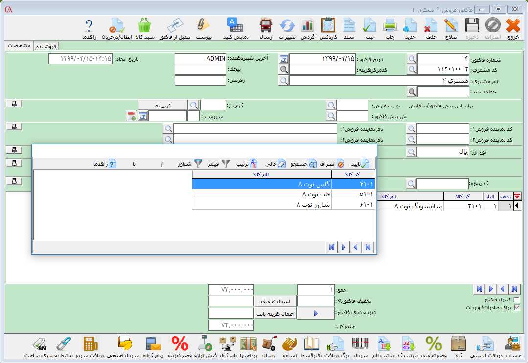 بعد از تعیین کالاهای مشابه، در هنگام صدور فاکتور بعد از انتخاب کالا، با استفاده از دکمه "کالاهای مشابه" میتوانید لیست کالاهای مشابه تعریف شده برای کالا را مشاهده و در صورت نیاز انتخاب کنید.