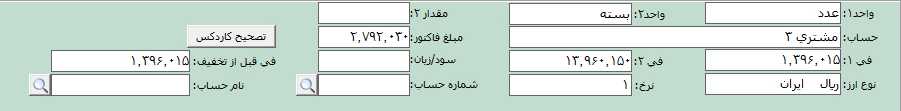 با انتخاب هر ردیف، در قسمت پایین فرم اطلاعات مربوط به آن نمایش داده میشود. به عنوان مثال در قسمت سود/زیان، سود/زیان مربوط به ردیف و در قسمت فی قبل از تخفیف، فی قبل از تخفیف ردیف نمایش داده میشود. چنانچه در قسمت شماره یا نام حساب، حسابی انتخاب شود، کليه تراکنشهای مربوط به حساب انتخابی با کالا نمايش داده میشود.