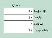 در قسمت اول دوره، مقدار اول دوره کالا نمايش داده میشود. در قسمت وارده مقدار کالاهای وارد شده و در قسمت صادره، مقدار کالاهای صادر شده در سیستم نمایش داده میشود و در قسمت پايان دوره، مانده مقداری كالا در زمان تهیه گزارش نمايش داده میشود.