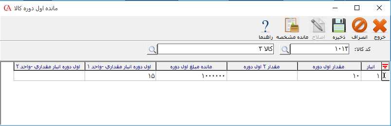 در فرم باز شده برای وارد کردن مانده موجودی کالا، ابتدا در قسمت انبار، نام انبار را انتخاب کرده سپس در قسمت مقدار اول دوره یا مقدار 2 اول دوره، موجودی کالا و در قسمت مانده مبلغ اول دوره، مبلغ کالا وارد کنيد. در صورتی که از حسابگر نسخه 10 استفاده میکنید، میتوانید در فرم مانده اول، در قسمت اول دوره انبار مقداری یا واحد 2 اول دوره انبار مقداری، موجودی انبار مقداری کالا را وارد نمایید. نکته: توجه داشته باشيد که با اين روش ورود مانده اول دوره ، حساب اقلام موجودی بدهکار نمیشود و بايد برای حساب اقلام موجودی به صورت دستی سند حسابداری صادر شود.