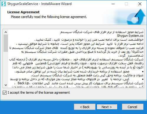 برای نصب مراحل زیر را انجام دهید: در DVD برنامه از مسیر Prog > Scale Service فایل ShygunScale.exe را اجرا کنید. در فرم باز شده چنانچه شرایط مجوز استفاده از نرمافزارهای شرکت شایگان سیستم را پذیرفتهاید گزینه I accept the terms of the license agreement را انتخاب کنید و سپس بر روی دکمه Next کلیک کنید.