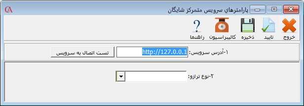 جهت اتصال ارتباط برنامه حسابگر با سرویس متمرکز شایگان از مسیر شرایط محیطی > پارامترهای سرویس متمرکز شایگان را انتخاب کنبد. در فرم باز شده در قسمت آدرس سرویس، آدرس IP کامپیوتری که سرویس متمرکز شایگان (Shygun Scale Service) بر روی آن نصب شده است را وارد کنید. به وسیله دکمه تست اتصال میتوانید وصل بودن سرویس را کنترل کنید.