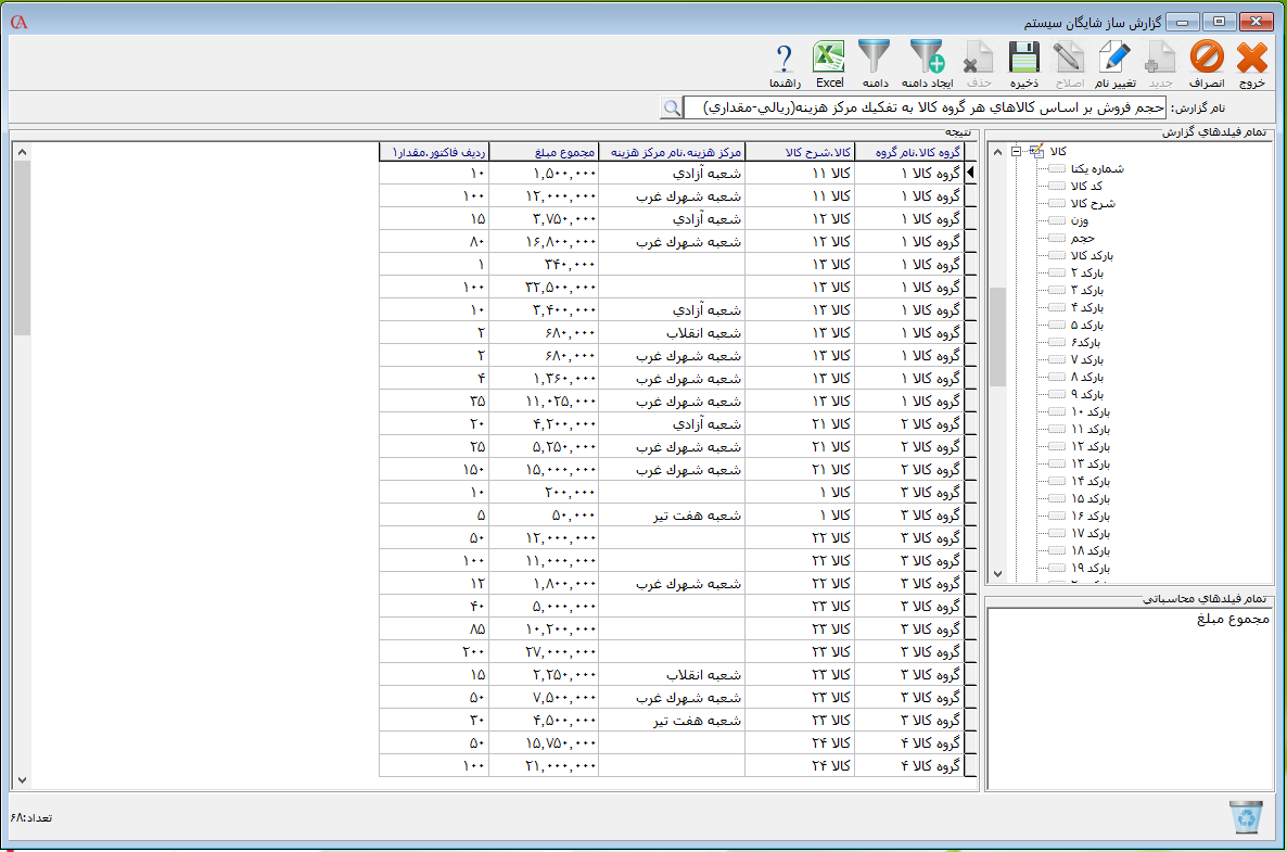 گزارش ساز شرکت شایگان سیستم برخلاف گزارشساز Fast Report و گزارش ساز Quick Report که محدود به استفاده از فیلدهای تعیینشده برای آن گزارش بودید، در اینجا میتوانید به دامنه گستردهای از فیلدها دسترسی داشته باشید. گزارشات این بخش در دو دسته «بر اساس فاکتورها» و «بر اساس سندها» قابل طراحی است که در قسمت بر اساس فاکتور میتوان گزارش را بر اساس اطلاعات فاکتورها و در قسمت بر اساس سندها براساس اطلاعات اسناد ایجاد نمود. برای ایجاد گزارش جدید از منو گزارشات > گزارشساز شایگان سیستم > دسته بندی مورد نظر (گزارش بر اساس فاکتورها یا سندها) را انتخاب کنید. به عنوان مثال چنانچه بخواهید گزارش حجم فروش بر اساس کالاهای هر گروه کالا به تفکیک مرکز هزینه را به صورت ریالی و تعدادی ایجاد کنید، در این بخش گزارش بر اساس فاکتورها را انتخاب کنید. در ادامه این مقاله آموزشی نحوه ایجاد گزارش با استفاده از گزارش ساز شرکت شایگان سیستم توضیح داده میشود.