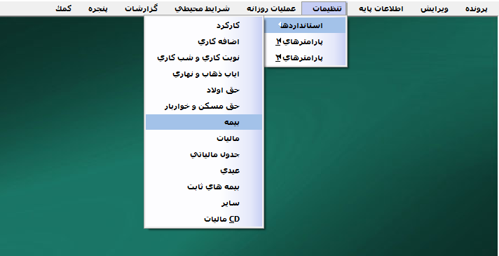 برای تعیین بیمههای مربوط به سهم کارگر و کارفرما از منوی تنظیمات > استاندارد ها > بیمه را انتخاب کنید.