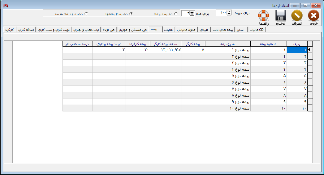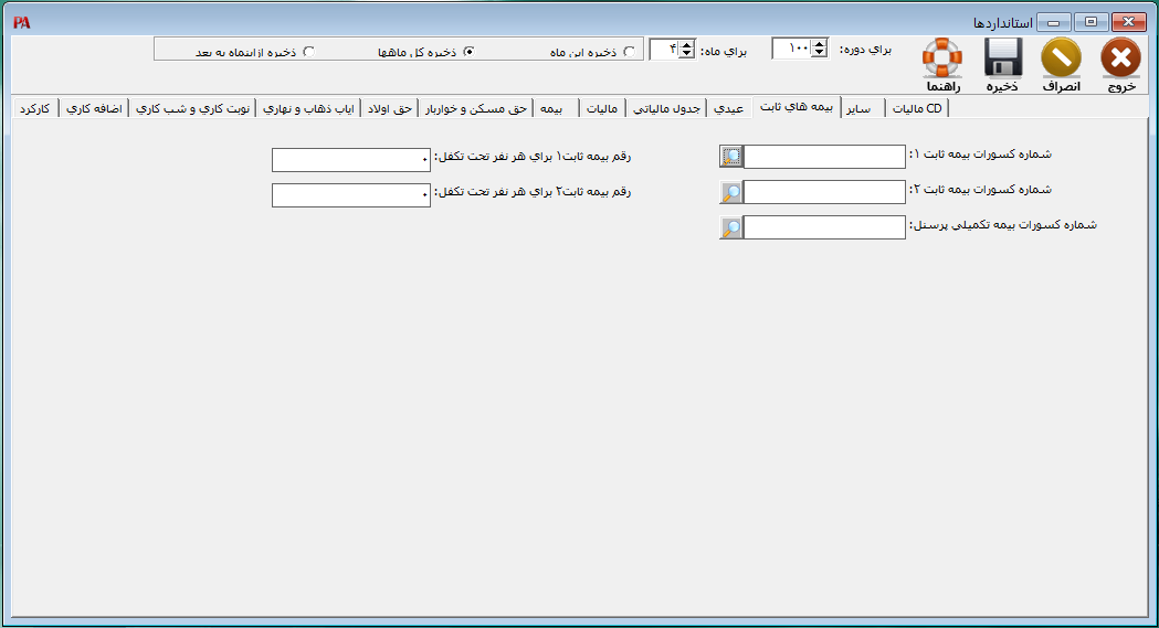 برای تعیین بیمههای ثابت و مبالغ مربوط به آنها از منوی تنظیمات > استاندارد ها > بیمه های ثابت را انتخاب کنید. در فرم باز شده بعد از تعیین موارد مورد نظر میتوانید اطلاعات را برای ماه جاری، کل ماهها یا ماه جاری به بعد تنظیم سپس بر روی دکمه ذخیره کلیک کنید.