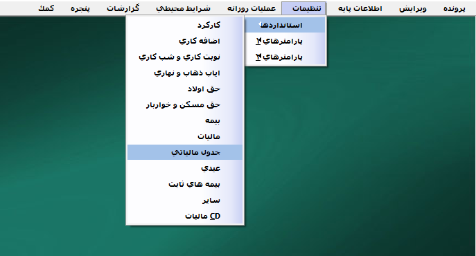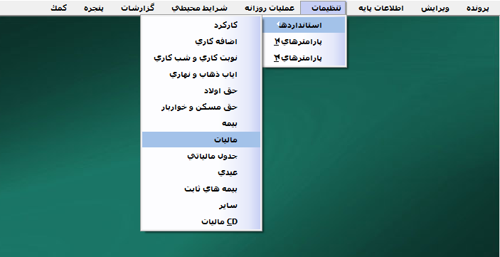 برای تعیین روش محاسبه انواع مالیات در نرم افزار حقوق و دستمزد از منوی تنظیمات > استاندارد ها > مالیات را انتخاب کنید.