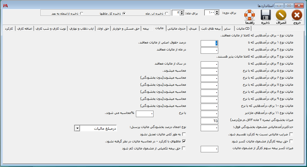 نکته: مالیاتهای نوع 1،2 و 5 تا 10 در سالهای قبل مورد استفاده قرار میگرفت و بر اساس قوانین جدید بلااستفاده میباشد. ضرایب مالیاتی نسبت به کارکرد تقسیم شود: در صورت فعال بودن این پارامتر، مالیات بر اساس کارکرد پرسنل محاسبه میشود و در غیر این صورت مالیات محاسبه میشود و با ماههای قبل تعدیل میشود.