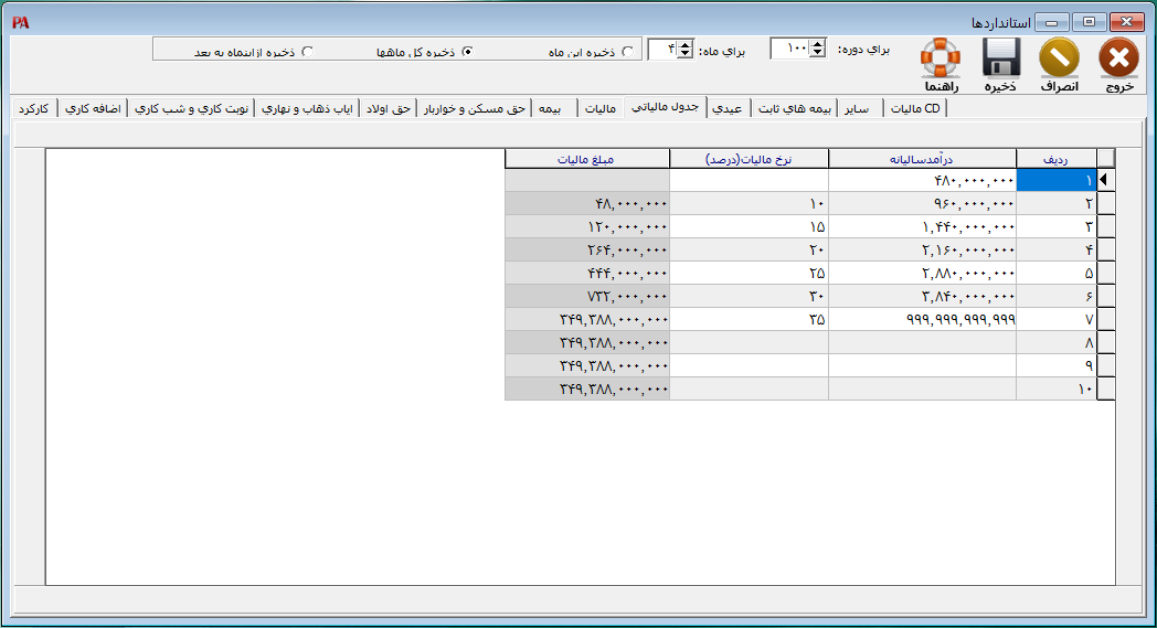 برای ثبت اطلاعات مربوط به جدول مالیاتی که هر ساله توسط شورای عالی کار تعیین میشود، از منوی تنظیمات > استاندارد ها > جدول مالیاتی را انتخاب کنید.