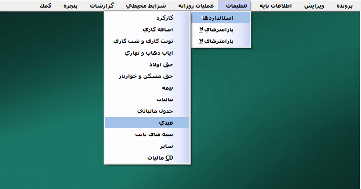 برای تعیین عیدی و اطلاعات مربوط به آن از منوی تنظیمات > استاندارد ها > عیدی را انتخاب کنید.