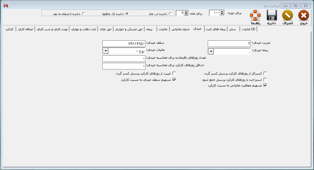 تسهیم معافیت مالیاتی به نسبت کارکرد: چنانچه بخواهید برای محاسبه مالیات عیدی و پاداش سالیانه، سقف معافیت مالیاتی را به نسبت کارکرد تسهیم نمایید، تیک مربوط به این پارامتر را فعال نمایید.
