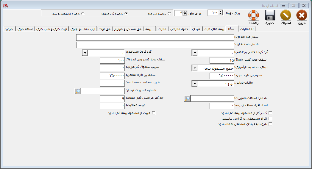 در ادامه قسمتهای موجود در این فرم توضیح داده میشود. شعار ماه خط اول: در صورتی که نیاز به چاپ جملاتی در روی فیش حقوق کارکنان داشته باشید، در قسمت شعار ماه، جملات مورد نظر خود را وارد کنید.