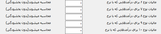 مالیات نوع 6 الی 10: این نوع مالیات برای درآمدهایی که درصد محاسبه مالیات آنها بدون بخشودگی توسط کاربر تعیین میشود، کاربرد دارد.