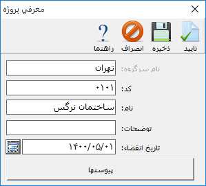 در فرم باز شده در قسمت کد، کد و در قسمت نام، نام پروژه را وارد کنید. در قسمت توضیحات، میتوانید توضیحات مربوطه و در قسمت تاریخ انقضا، میتوانید تاریخ انقضا آن را انتخاب کنید همچنین در قسمت پیوستها میتوانید پیوست پروژه را انتخاب کنید.