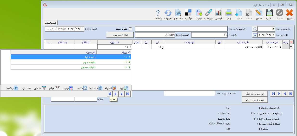 نکته: توجه داشته باشید که نحوه اختصاص پروژه به دیگر فاکتورها به همین ترتیب است. برای اختصاص پروژه به ردیف اسناد در هنگام صدور ردیف سند، در ستون کد پروژه، سطح مرتبط را انتخاب کنید.