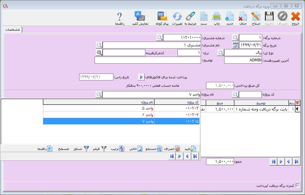 نکته: در حسابگر میتوانید در انواع گزارشات از فیلتر پروژه استفاده نمایید. همچنین میتوانید در گزارش صورت حساب مشتری (shift+1) از این قابلیت برای تفکیک تراکنشهای مالی خود استفاده کنید.