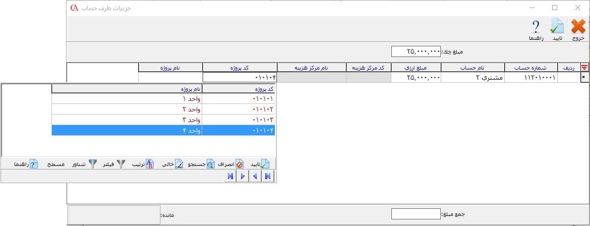 برای اختصاص پروژه به برگه دریافت و پرداخت وجه در هنگام صدور برگه بعد از انتخاب حساب، در قسمت کد و نام پروژه، بر روی دکمه ذرهبین کلیک کنید و سطح مورد نظر را انتخاب کنید.