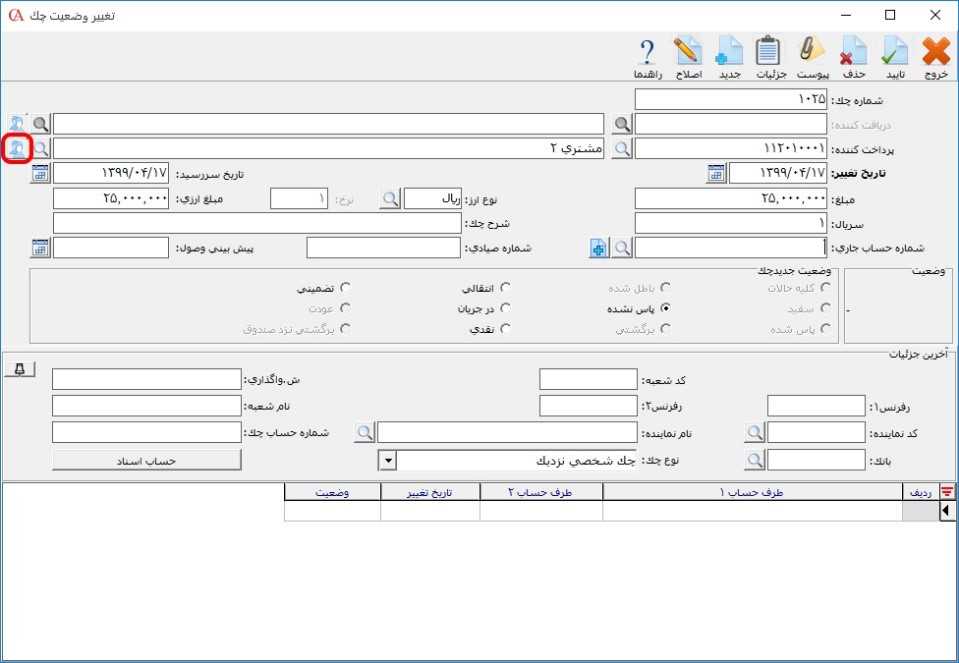 در نرم افزار حسابداری حسابگر برای اختصاص پروژه به چک، بعد از ثبت اطلاعات چک بر روی دکمه "اختصاص چک به چند نفر" کلیک کنید.