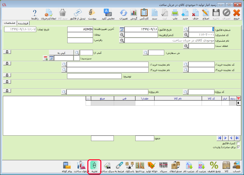 در فرم رسید انبار تولید برای تولید محصول تجزیه بر روی دکمه تجزیه کلیک نمایید.