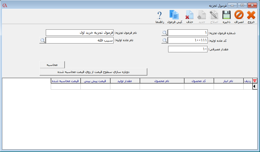 در فرم باز شده برای تعریف فرمول جدید بر روی دکمه جدید کلیک کنید. در قسمت نام فرمول تجزیه، نام فرمول را وارد نمایید در قسمت کد یا نام ماده اولیه، کد یا نام ماده اولیه محصول خود را وارد نمایید. در قسمت مقدار مصرفی، مقدار مصرفی که میخواهید فرمول بر اساس آن تعریف شود را وارد کنید. فرض کنید وزن صندوق سیب 10 کیلوگرم است که در این صورت در قسمت مقدار مصرفی عدد 10 را وارد نمایید.