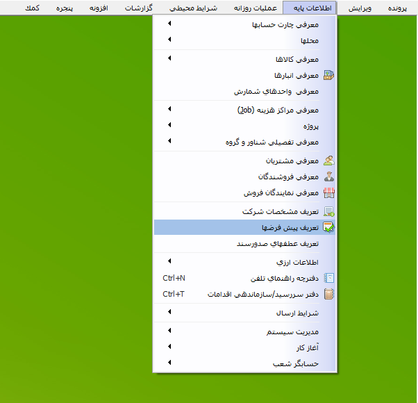 در این مقاله آموزشی نحوه تعریف حسابهای پیش فرض در نرم افزار حسابداری حسابگر شرکت شایگان سیستم توضیح داده میشود. برای تعریف حسابهای پیشفرض از منوی اطلاعات پایه > تعریف پیشفرضها را انتخاب کنید.