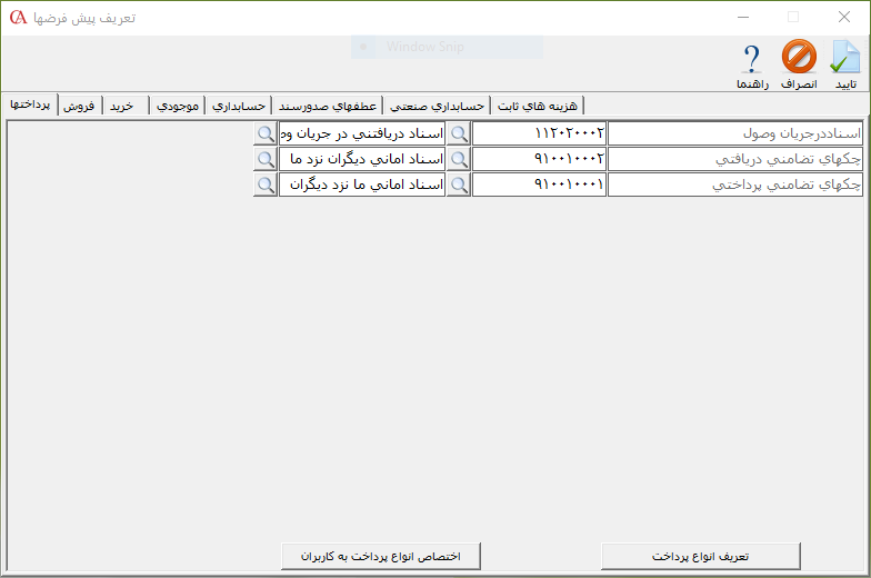 در زبانه پرداختها حسابهای پیشفرض سیستم را تعیین کنید. در قسمت اسناد در جریان وصول حساب مرتبط با اسناد در جریان وصول، در قسمت چکهای تضامنی دریافتی، حساب مربوط به چکهای تضامنی دریافتی و در قسمت چکهای تضامنی پرداختی حساب مربوط به چکهای تضامنی پرداختی را تعیین کنید. با تعیین این حسابها در هنگام صدور چک و تغییر وضعیت چک به حالت در جریان و تضامنی، سند حسابداری مرتبط با آن به صورت اتوماتیک با توجه به این حسابها صادر میگردد. در این زبانه علاوه بر تعیین حسابهای پیش فرض مرتبط با پرداخت میتوانید انواع پرداخت را در سیستم تعریف نمایید و انواع پرداخت تعریف شده را به کاربران اختصاص دهید. جهت آشنایی با تعریف انواع دریافت / پرداخت وجه در نرم افزار حسابگر میتوانید به راهنمای آن مراجعه فرمایید.