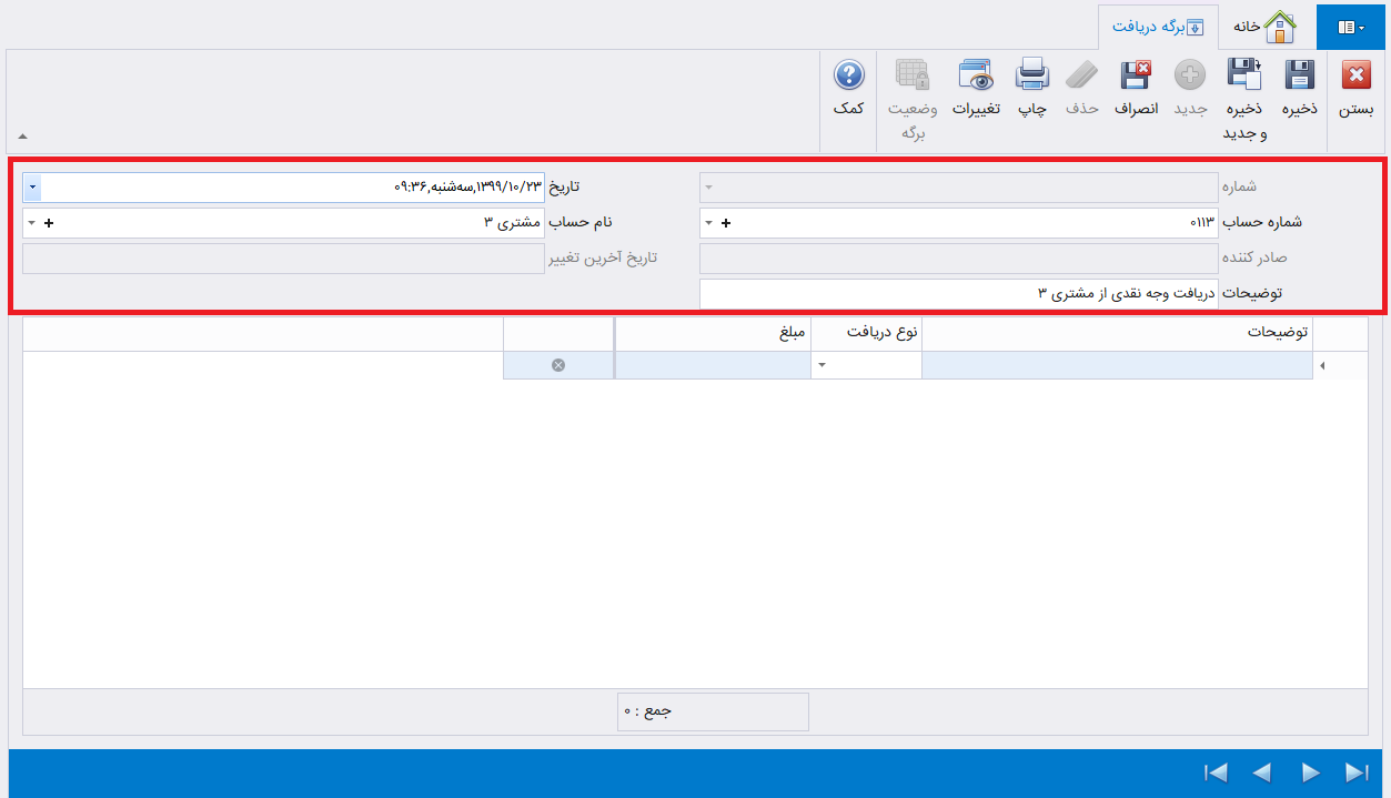 برای ثبت ردیفهای برگه دریافت وجه، در جدول یک سطر جدید ایجاد کنید. در ستون توضیحات میتوانید توضیحات ردیف دریافت را وارد کنید. در ستون مبلغ، مبلغ دریافتی و در ستون نوع، نوع دریافت (نقد ،چک پول و...) را از لیست کشویی انتخاب کنید. بعد از تعیین موارد مورد نظر بر روی دکمه ذخیره کلیک کنید.