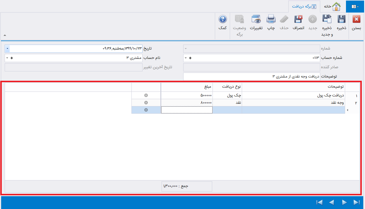 با استفاده از دکمه تغییرات میتوانید، تغییرات انجام شده روی برگه دریافت وجه را مشاهده کنید.