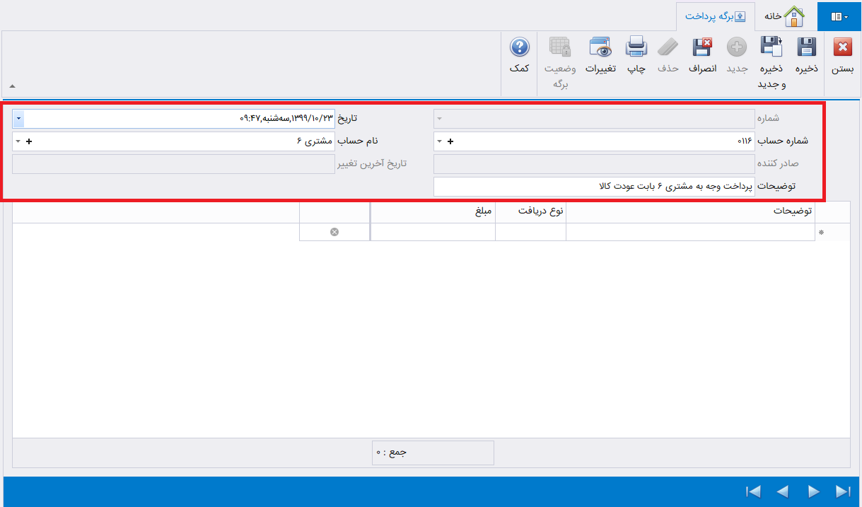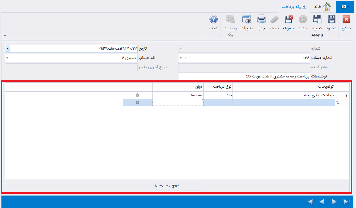 برای ثبت ردیفهای برگه پرداخت وجه، در جدول یک سطر جدید ایجاد کنید. در ستون توضیحات میتوانید توضیحات ردیف پرداخت را وارد کنید. در ستون مبلغ، مبلغ دریافتی و در ستون نوع، نوع پرداخت (نقد، چک پول و ....) را از لیست کشویی انتخاب کنید. بعد از تعیین موارد مورد نظر بر روی دکمه ذخیره کلیک کنید.