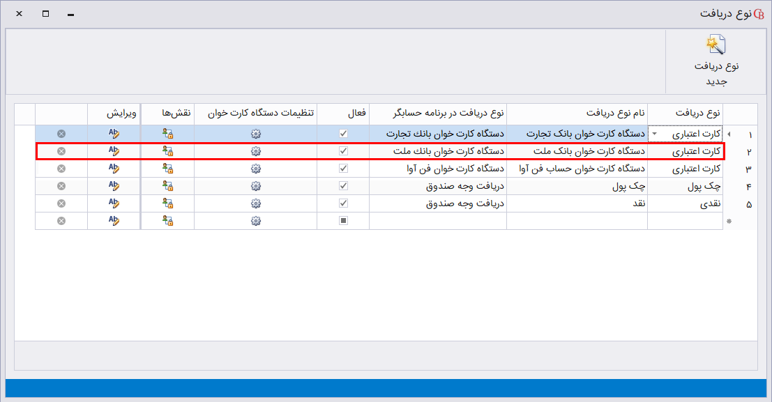 بعد از تعریف نوع دریافت جدید، جهت ویرایش اطلاعات مربوط به آن میتوانید بر روی دکمه