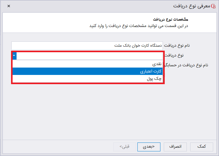 در قسمت نوع دریافت، نوع دریافت مورد نظر را از لیست باز شده انتخاب کنید. توجه داشته باشدی که نوع دریافت میتواند شامل سه حالت نقدی، کارت اعتباری و چک پول باشد.