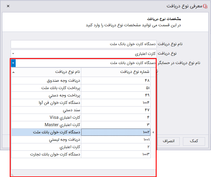 در قسمت نام نوع دریافت در حسابگر، نوع دریافت مرتبط در نرم افزار حسابگر دفتر مرکزی را انتخاب کنید. جهت اشنایی با نحوه معرفی انواع دریافت/پرداخت وجه در نرم افزار حسابگر میتوانید به راهنمای آن مراجعه فرمایید.