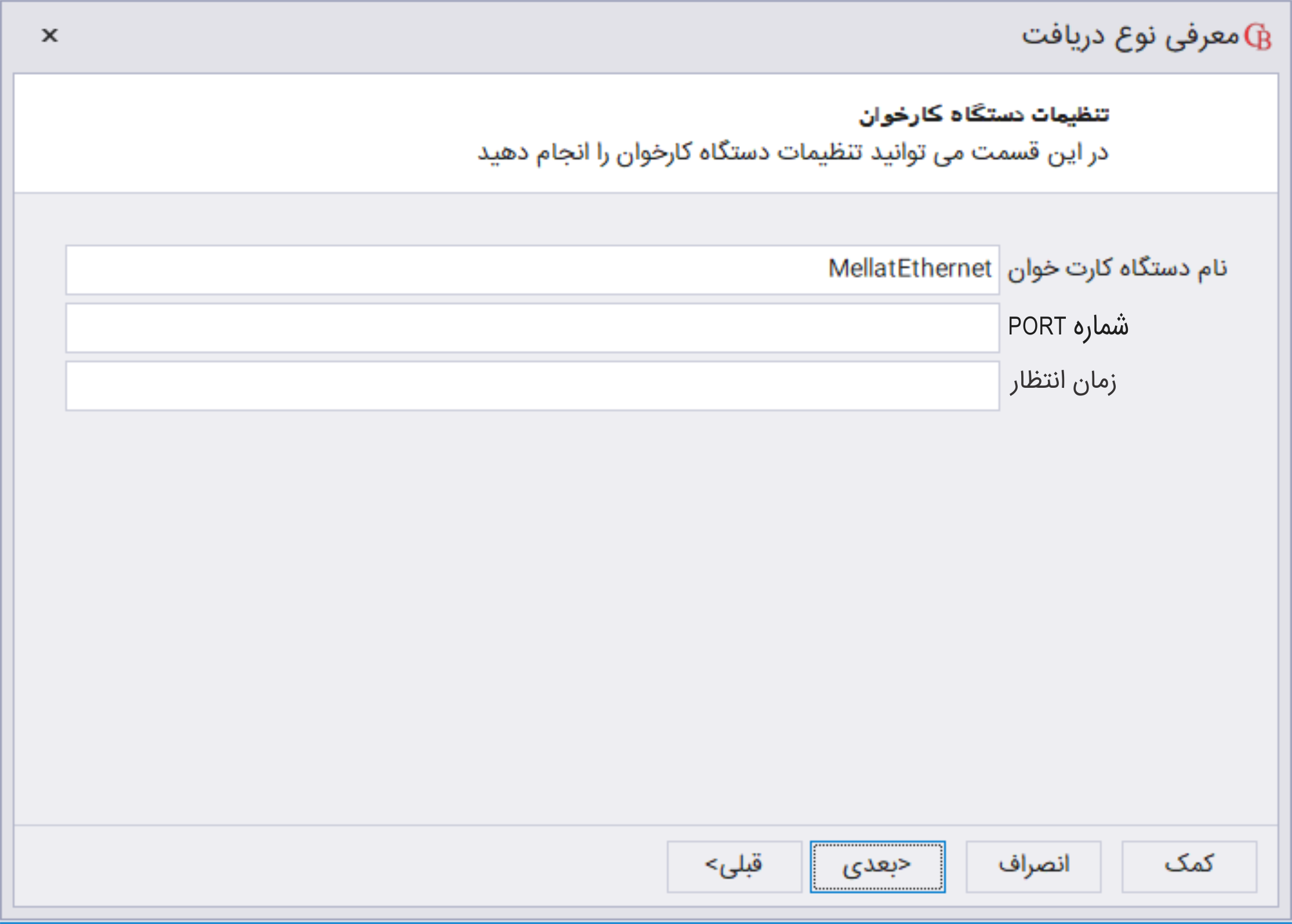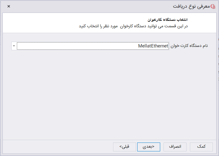 در مرحله بعد چنانچه نوع دریافت تعریف شده دستگاه کارت خوان بانکی باشد در قسمت نام دستگاه کارت خوان، نام دستگاه مورد نظر را لیست کشویی انتخاب سپس بر روی دکمه بعدی کلیک کنید.
