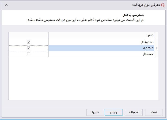 به صورت پیش فرض بعد از تعریف انواع دریافت وجه در برنامه فروشگاهی شعب کاربران دسترسی استفاده از آن را ندارند. در این مرحله میتوانید نحوه دسترسی نوع دریافت تعریف شده را به نقشها تعیین کنید.