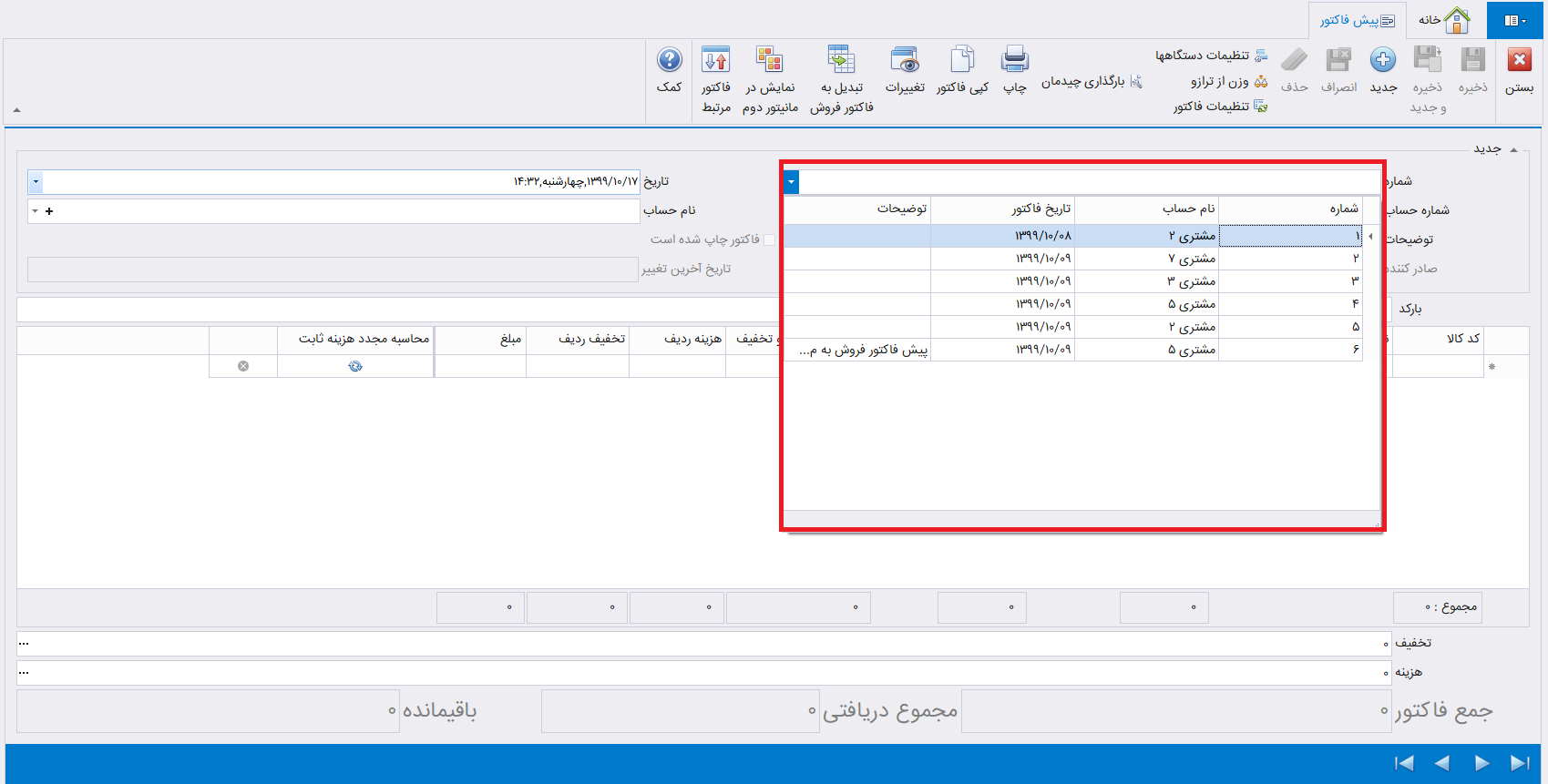 برای صدور پیش فاکتور جدید بر روی دکمه جدید کلیک کنید. در قسمت تاریخ، تاریخ پیش فاکتور را انتخاب کنید. در قسمت شماره حساب یا نام حساب، طرف حساب پیش فاکتور را از لیست کشویی حسابها انتخاب کنید. همچنین با انتخاب دکمه