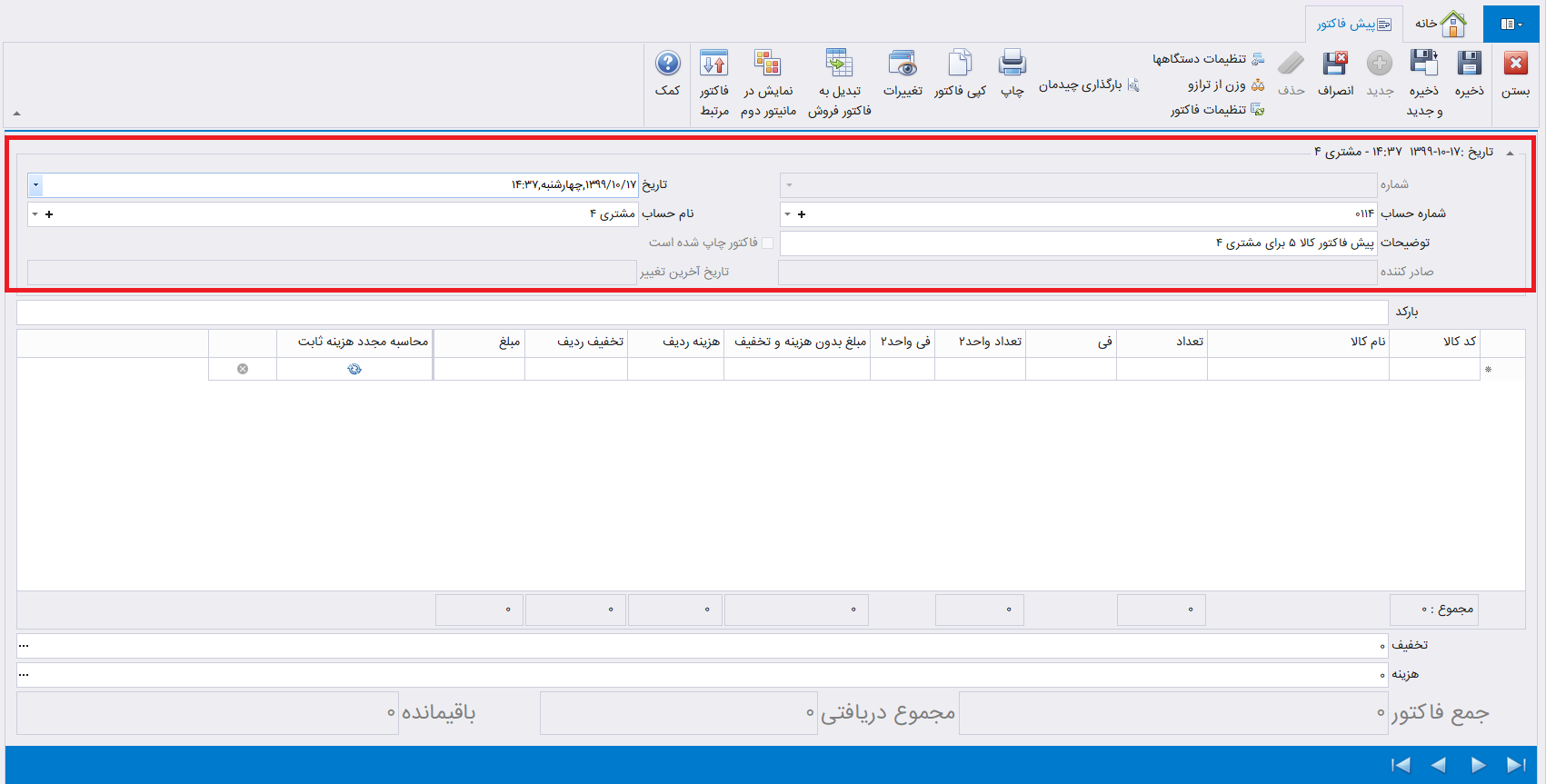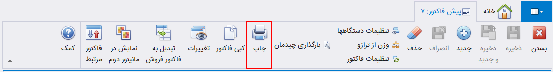 برای چاپ پیش فاکتور در بالا فرم فاکتور بر روی دکمه چاپ کلیک کنید تا پیش فاکتور انتخاب شده چاپ شود.