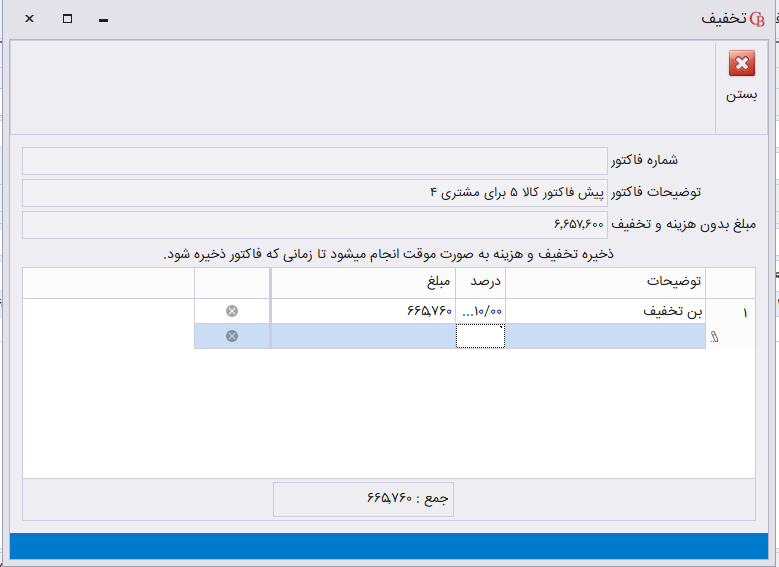 در فرم باز شده برای ثبت تخفیف کلی پیش فاکتور یک سطر جدید ایجاد کنید. در ستون توضیحات میتوانید توضیحات تخفیف را وارد کنید. در ستون درصد یا مبلغ میتوانید مقدار تخفیف را وارد کنید سپس دکمه بستن را فشار دهید.