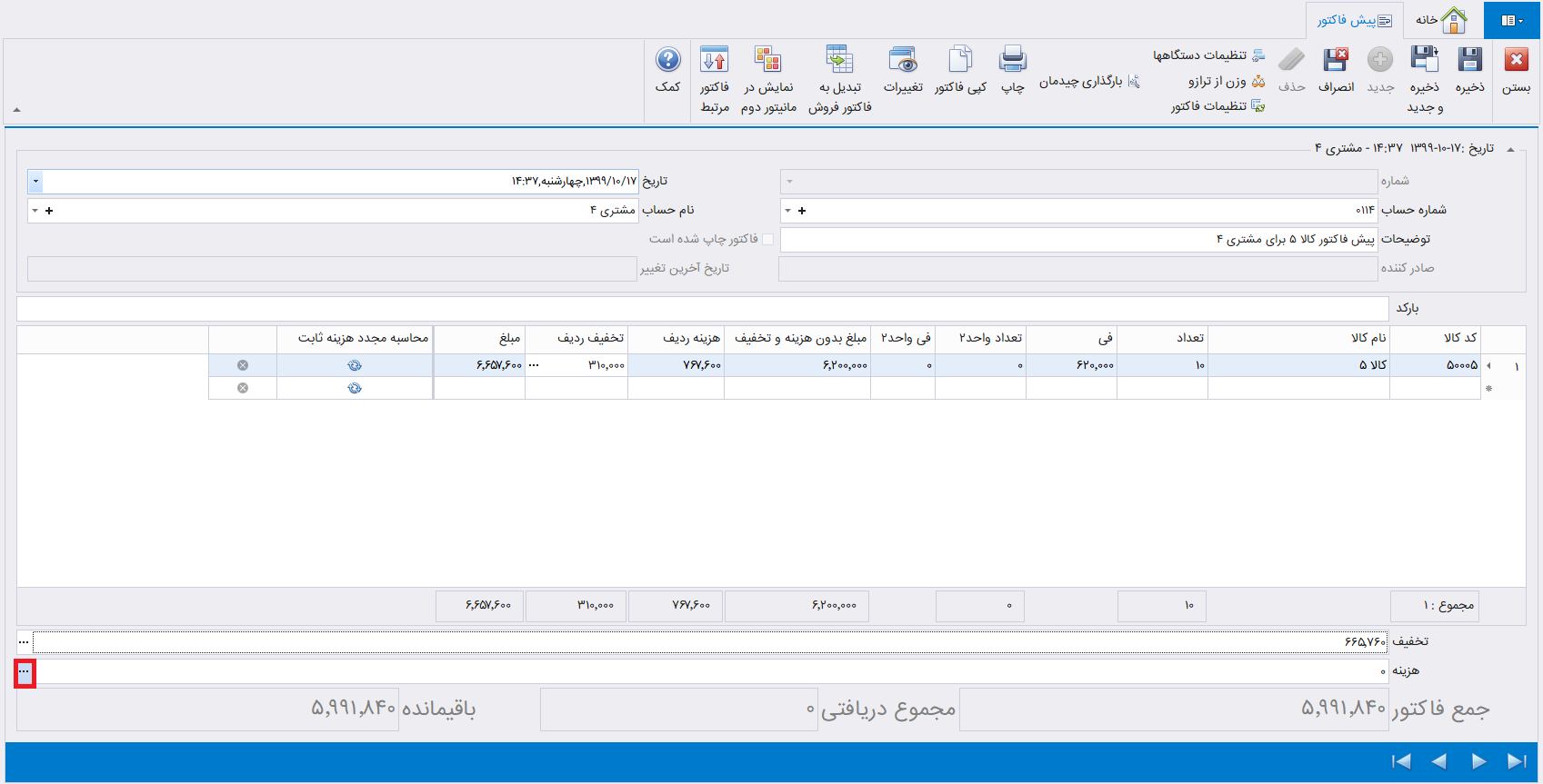 ثبت هزینه ردیف پیش فاکتور فروش برای ثبت تخفیفهای ردیف پیش فاکتور در ستون تخفیف ردیف بر روی دکمه کلیک کنید.