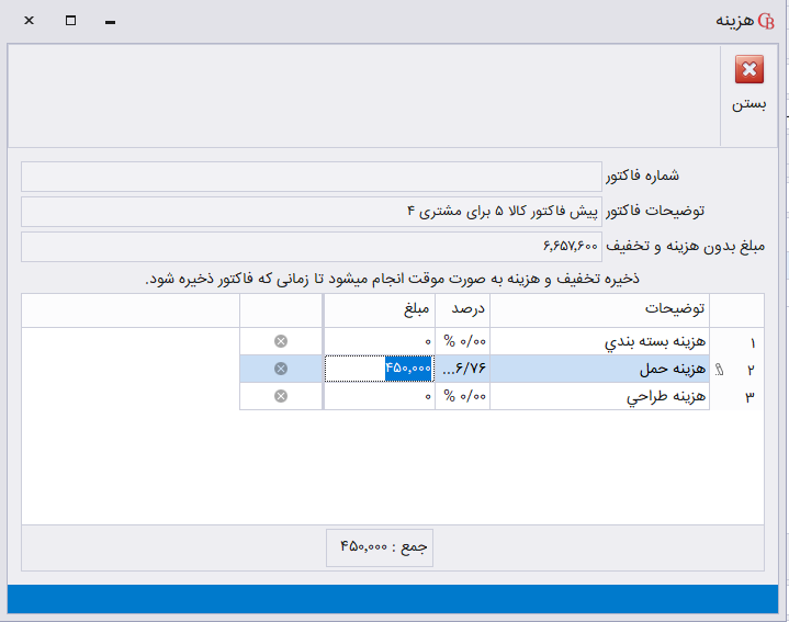 در فرم باز شده برای ثبت هزینه کلی پیش فاکتور یک سطر جدید ایجاد کنید. در ستون توضیحات میتوانید توضیحات هزینه را وارد کنید. در ستون درصد یا مبلغ میتوانید مقدار هزینه را وارد کنید سپس دکمه بستن را فشار دهید.